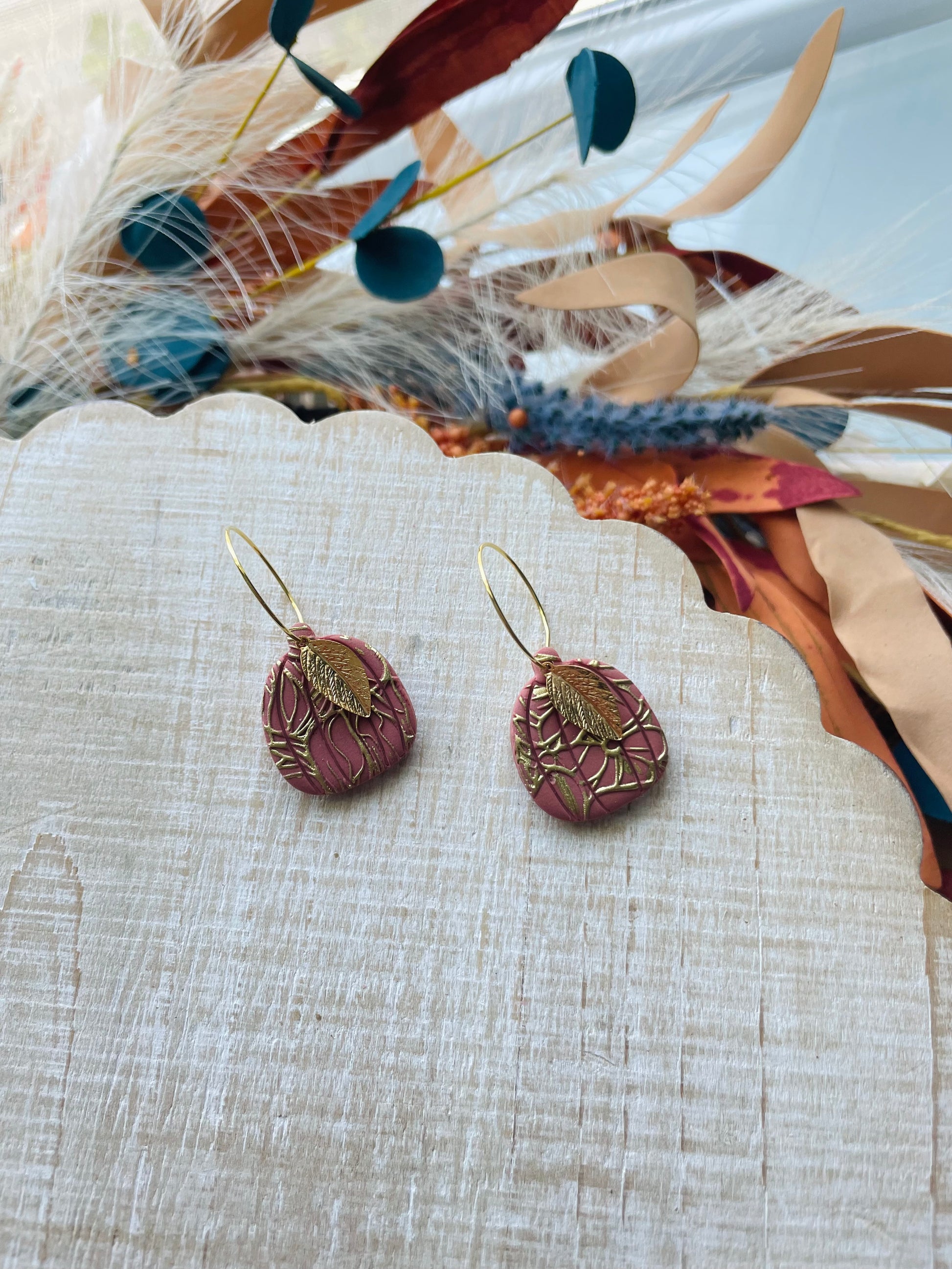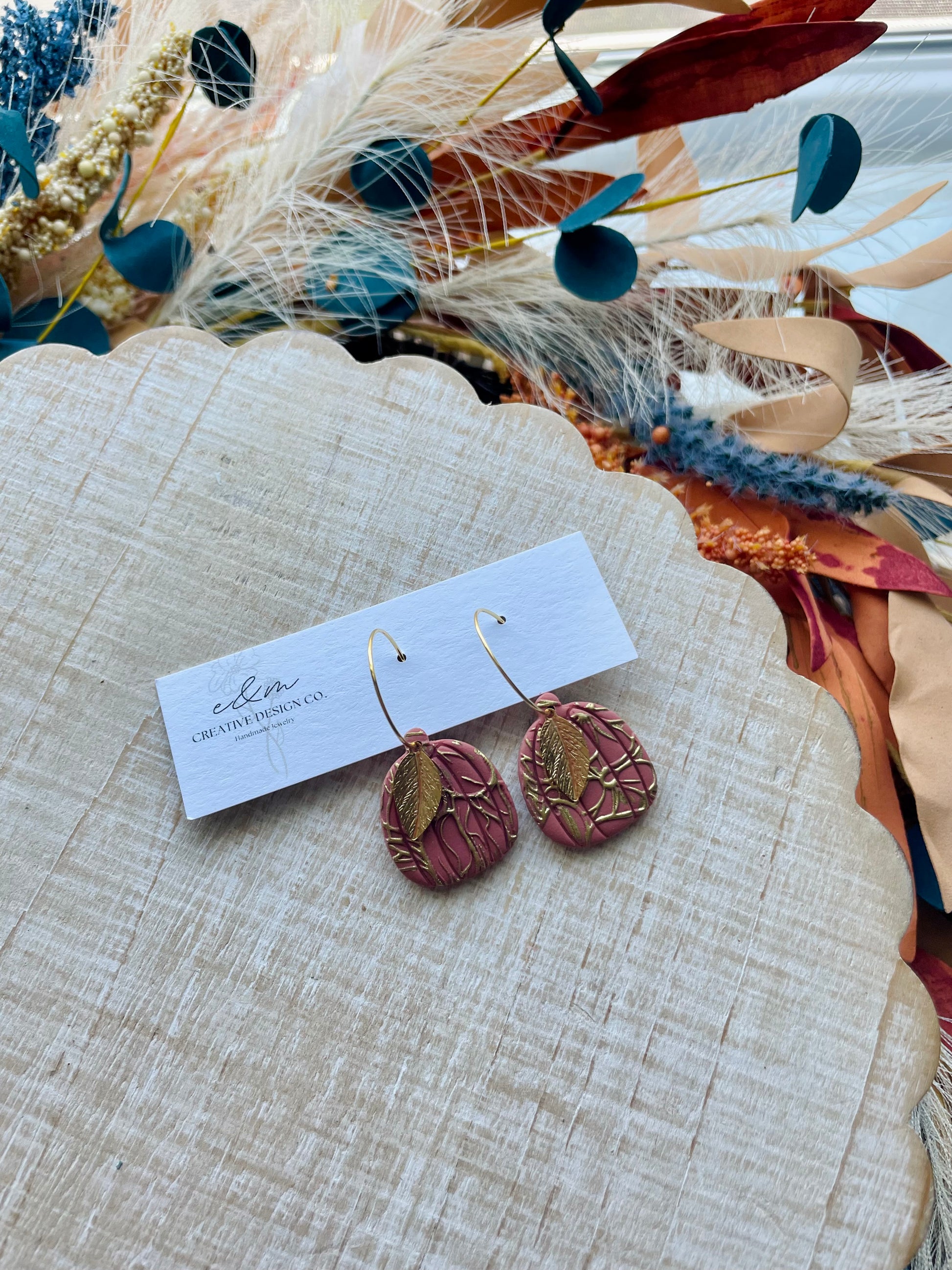 Floral pattern pumpkins with a gold touch. Paired with a gold leaf on a hoop. Lightweight and Fall ready!