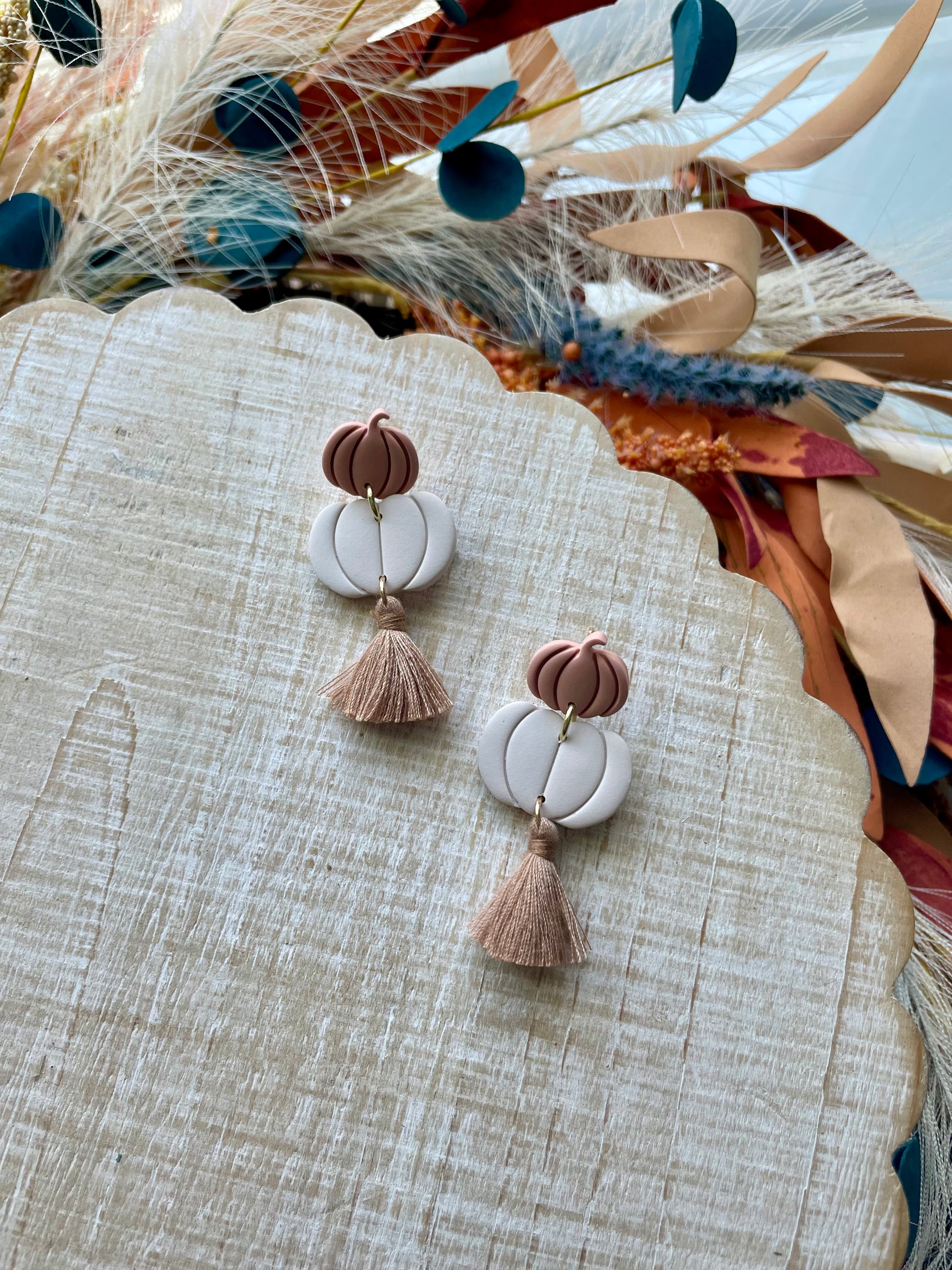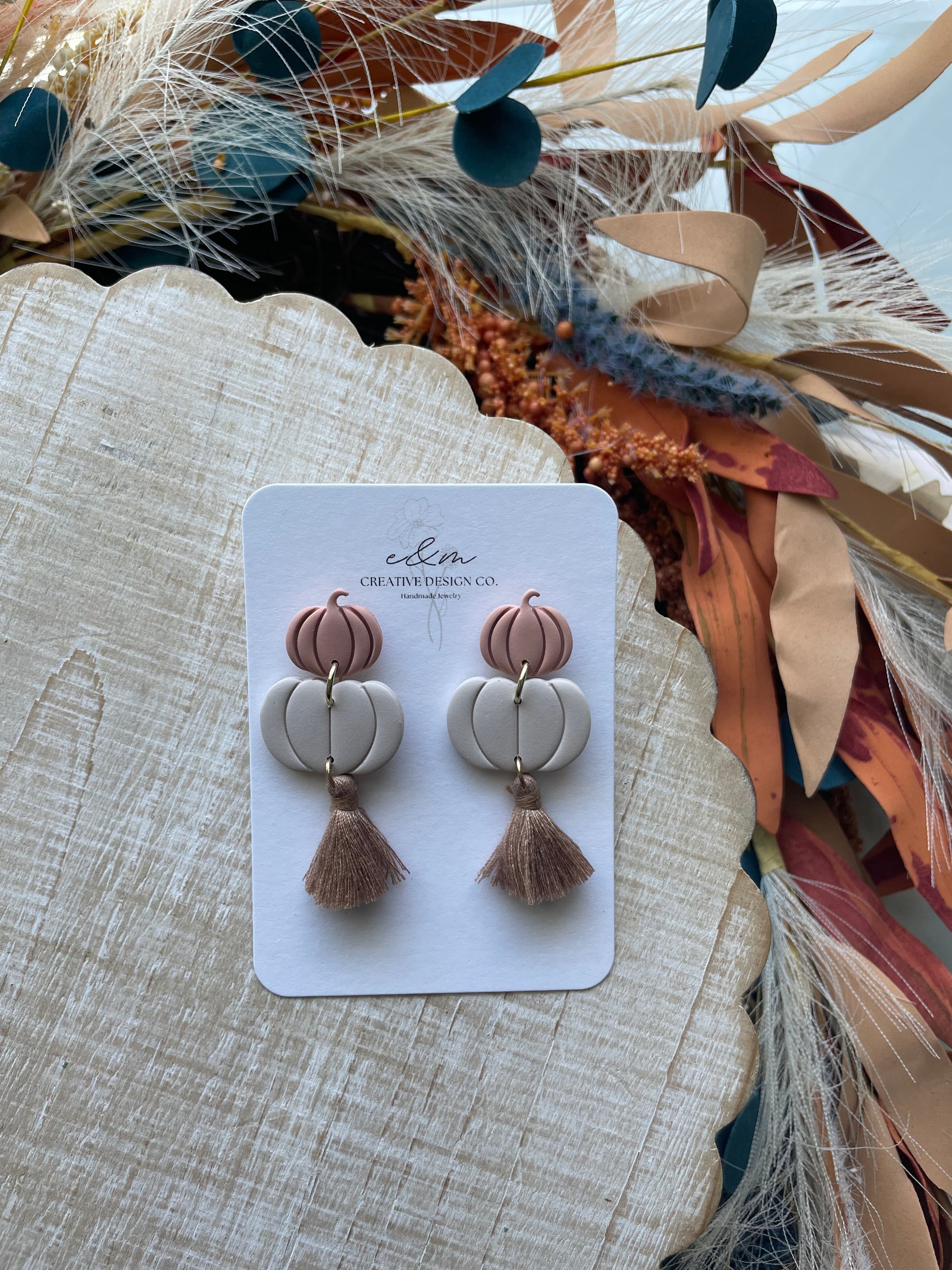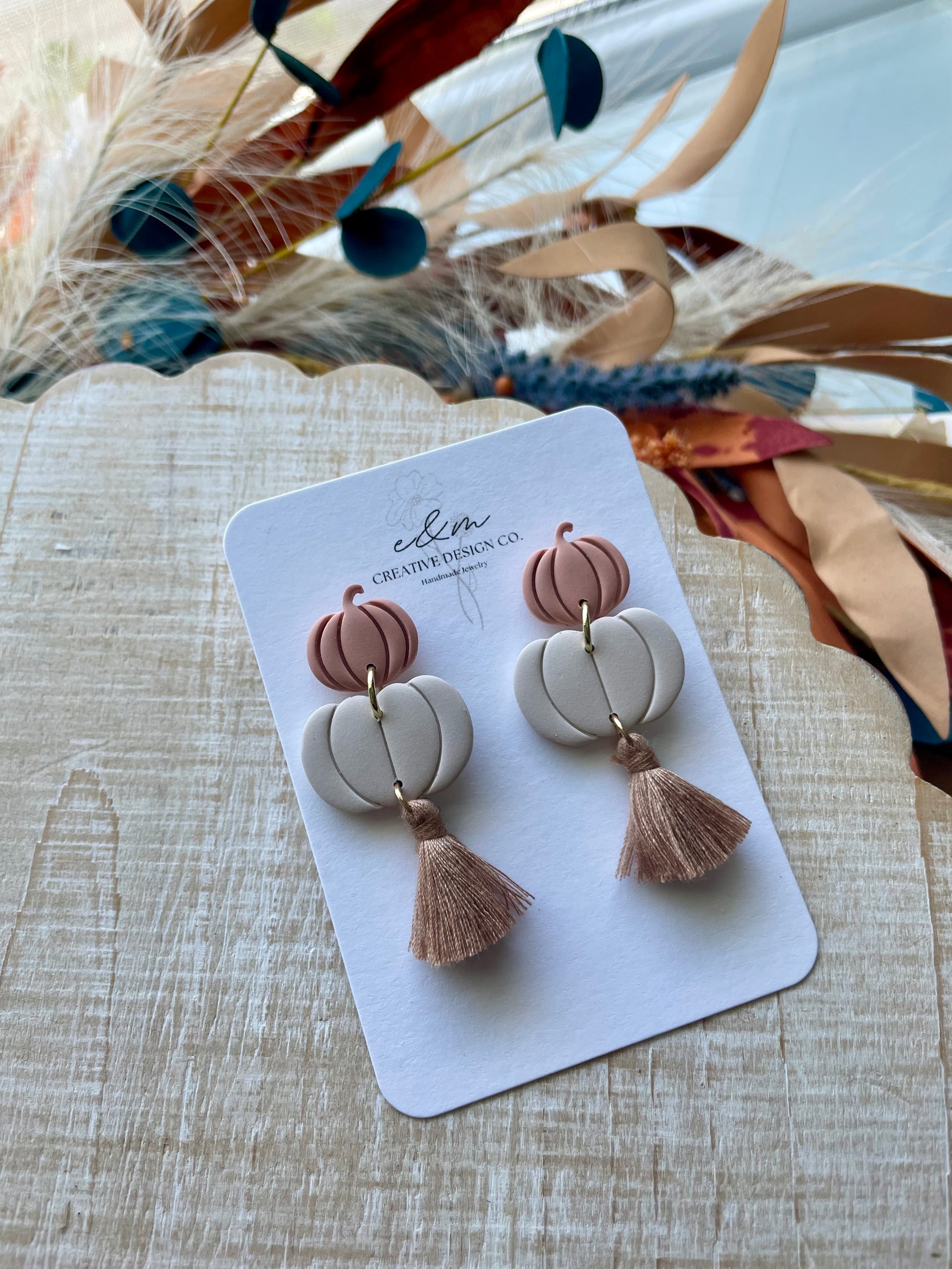 Neutral colored tiered pumpkins with a flare of tassel on the bottom. Lightweight and perfect pair to your fall sweater!